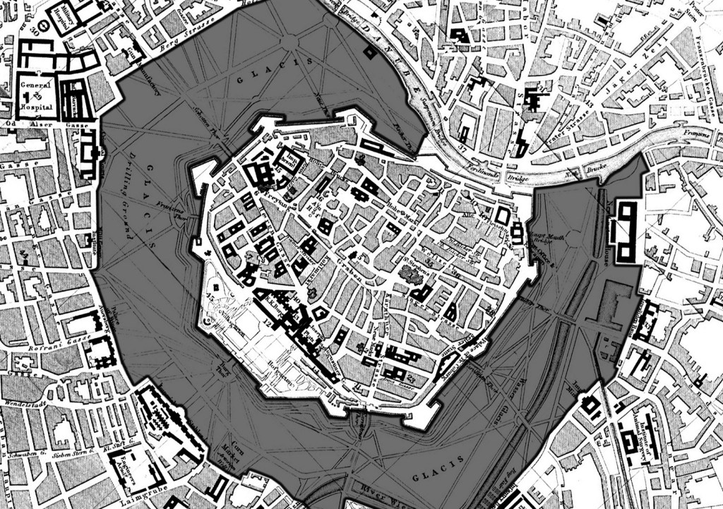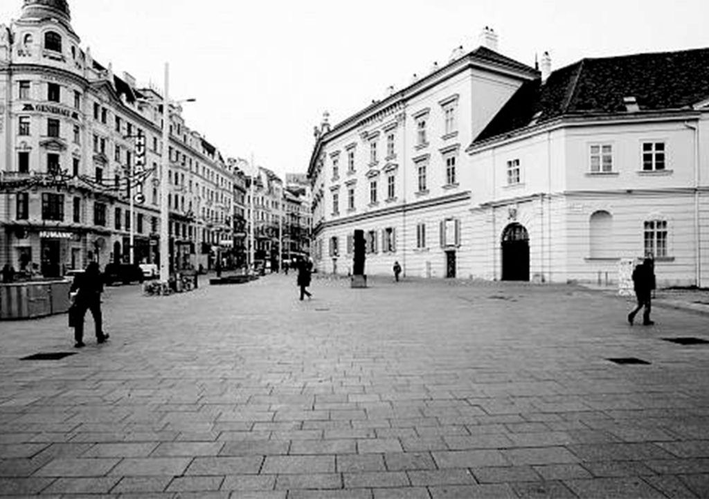 Looking back at the map of Vienna between 1529 to 1858, the large darkened area around the Altstadt presents a striking image – the Wiener Glacis (image left). The Wiener Glacis is an open space between the Vienna city walls and the suburbs which originally served defense purposes, and later becomes a park where street vendors and wanderers meet (image right). The Casa Piccola sits right at the fringe of the Wiener Glacis. Everything built in front of it is new, and the large plaza traces back to this piece of history that even the exhibitor who grows up in Vienna has lost.