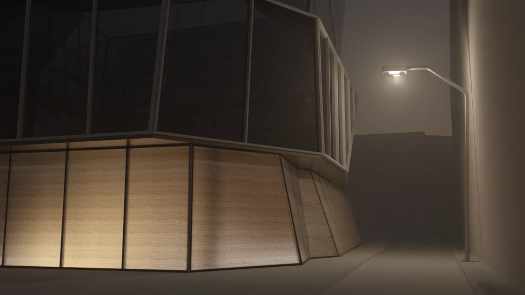 The launch venue has translucent stone laminated stone glass, contrasted with mesh ceiling and furniture. It is a dark, intimate and dramatic space that focuses the attention on the products to be launched. The translucent walls shows that there is an event inside, while not being totally visible from the outside.